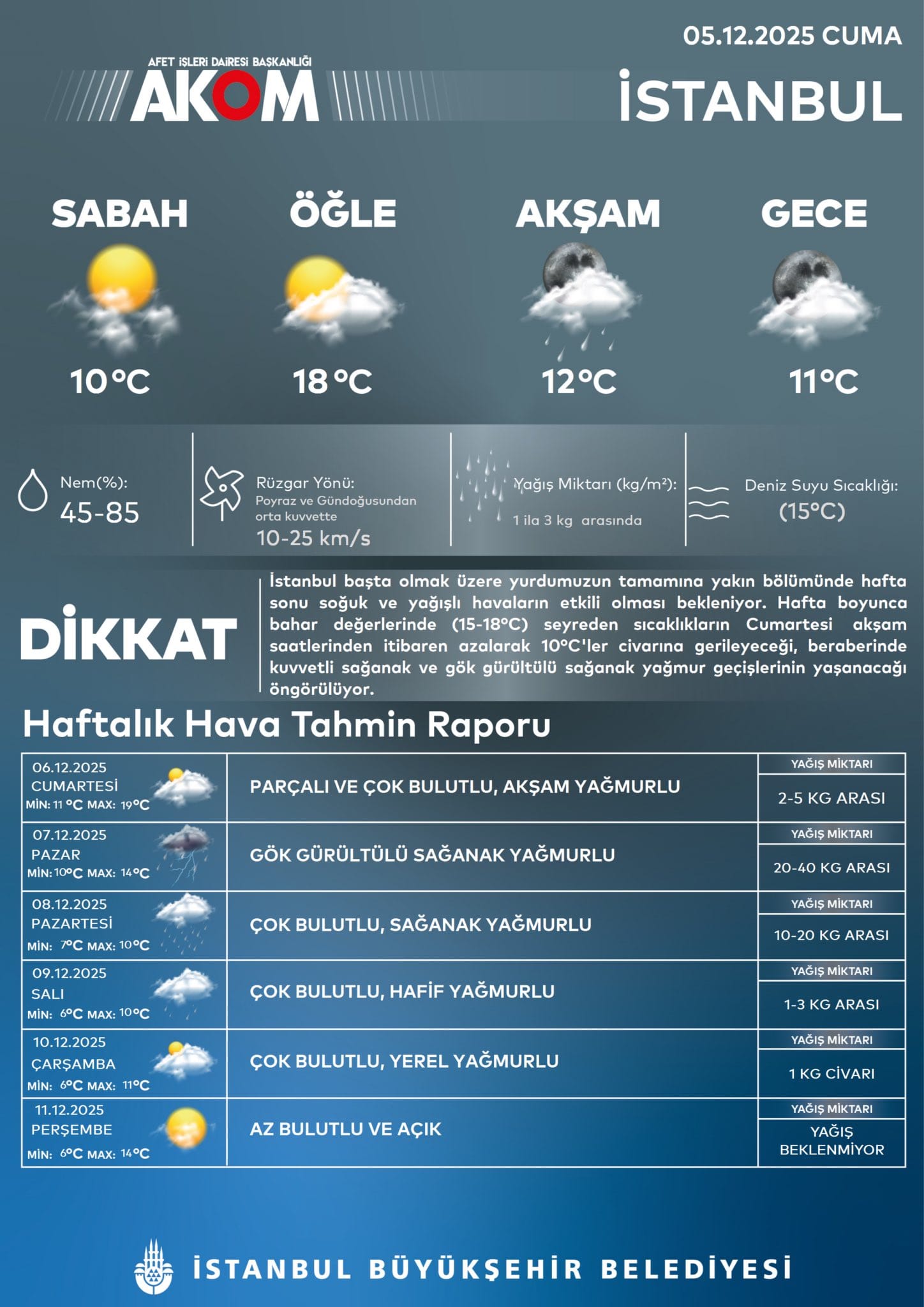 “İstanbul başta olmak üzere yurdumuzun tamamına yakın bölümünde hafta sonu soğuk ve yağışlı havaların etkili olması bekleniyor. Hafta boyunca bahar değerlerinde (15-18°C) seyreden sıcaklıkların cumartesi akşam saatlerinden itibaren azalarak 10°C’ler civarına gerileyeceği, beraberinde kuvvetli sağanak ve gök gürültülü sağanak yağmur geçişlerinin yaşanacağı öngörülüyor.”