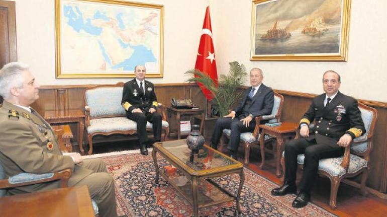 Hulusi Akar’ın bakanlığı döneminde, Romanya Deniz Kuvvetleri Komutanı Mihai Panait’i kabulünde de aynı oturma düzeninin uygulandığı görüldü.